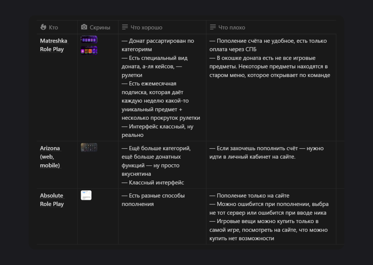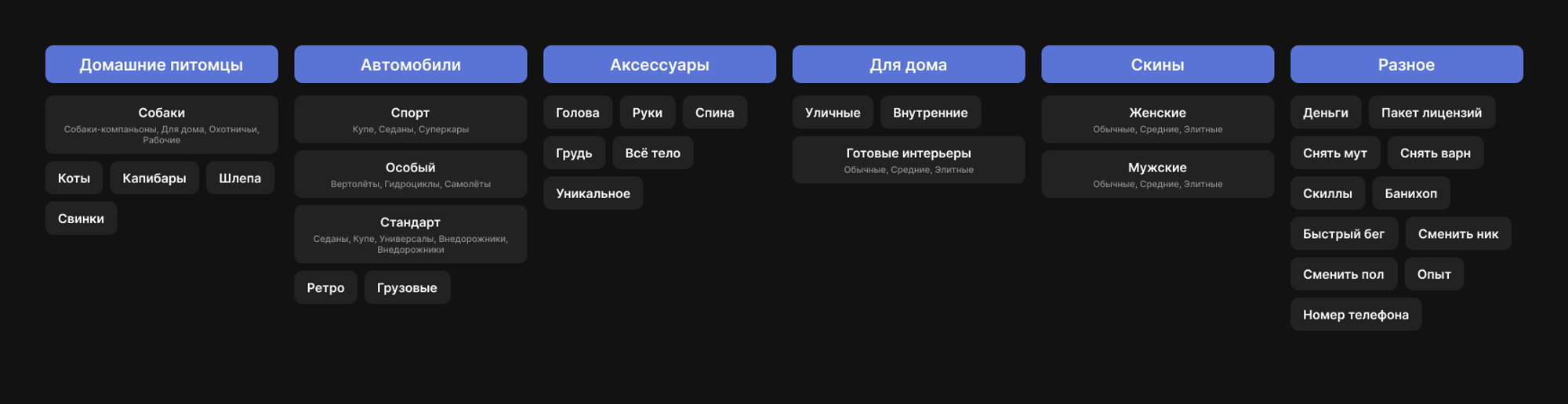 Чтобы понять, что вообще должно быть в донатном разделе, я изучил все игровые предметы в игре и составил табличку