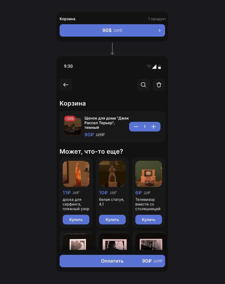 При покупке товара выскакивает плавающая корзина. В самой корзине есть небольшая проблема, которую я не смог продумать в флоу и при тестах она себя не особо выдала — это удаление из корзины