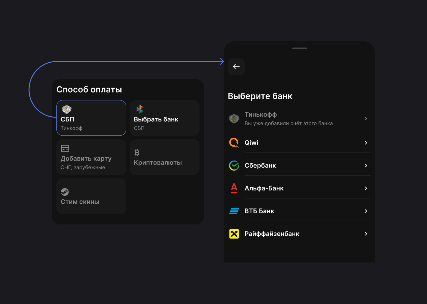 Внутри приложения доступны два способа оплаты, которые позволяют пользователю оплатить внутри приложения — СБП и картами. Другие два — с пересылкой на форму оплаты в браузере